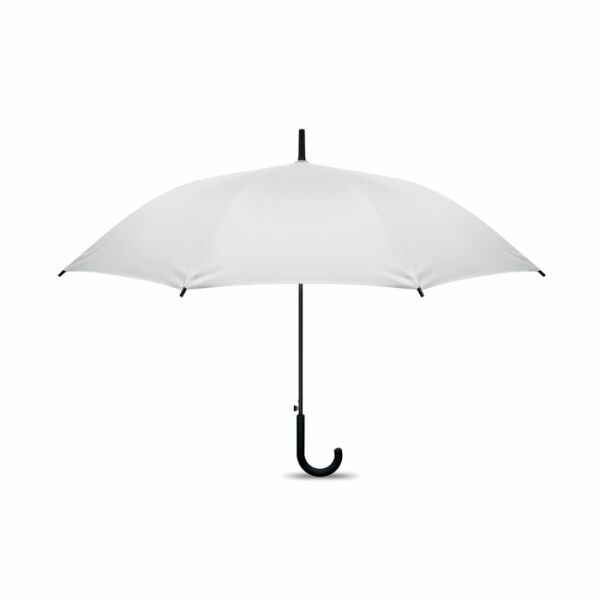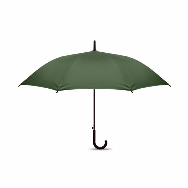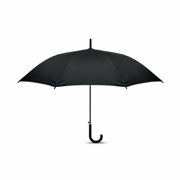 23 inch rechte automatisch openende windproof paraplu met een volledig fiberglas frame en panelen in 190T pongee stof. Plastic tips en bovenkant. Met rubber bekleed PP plastic gebogen handgreep. Handmatige sluiting.