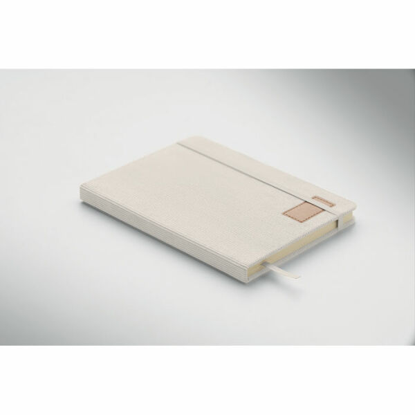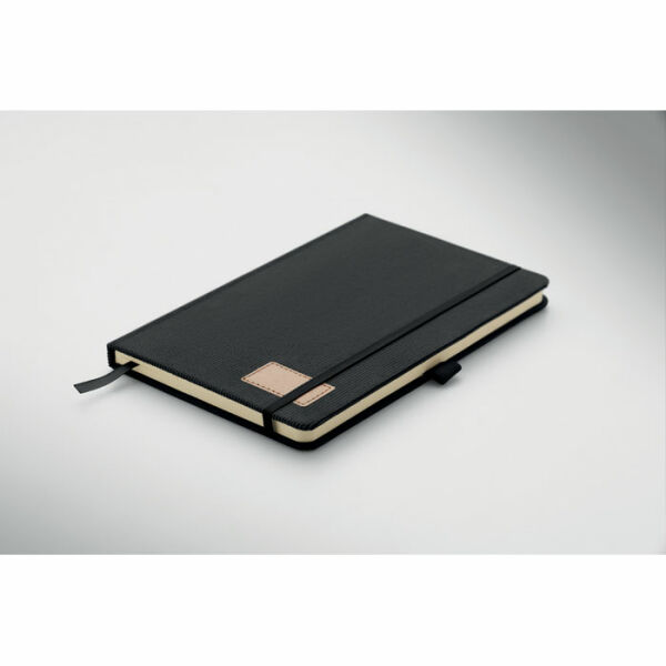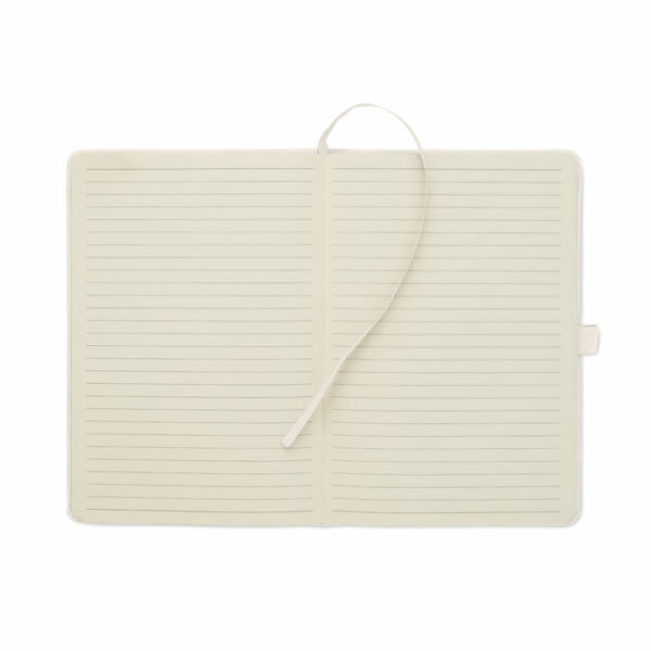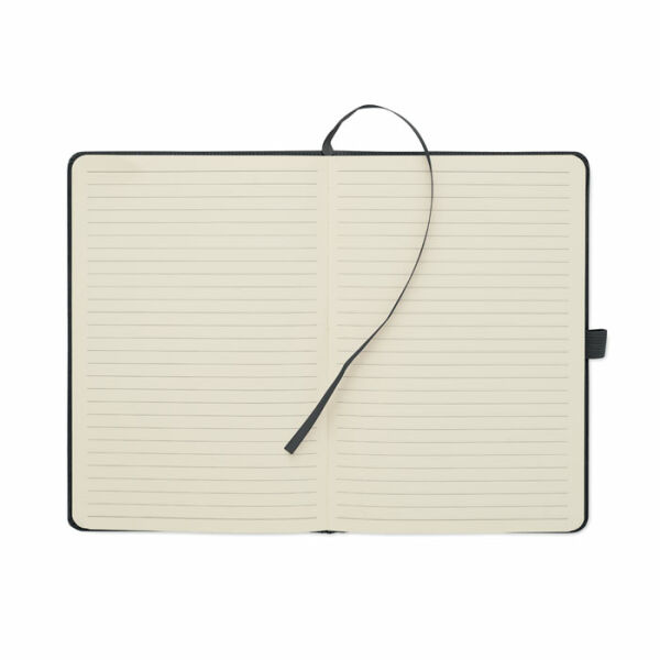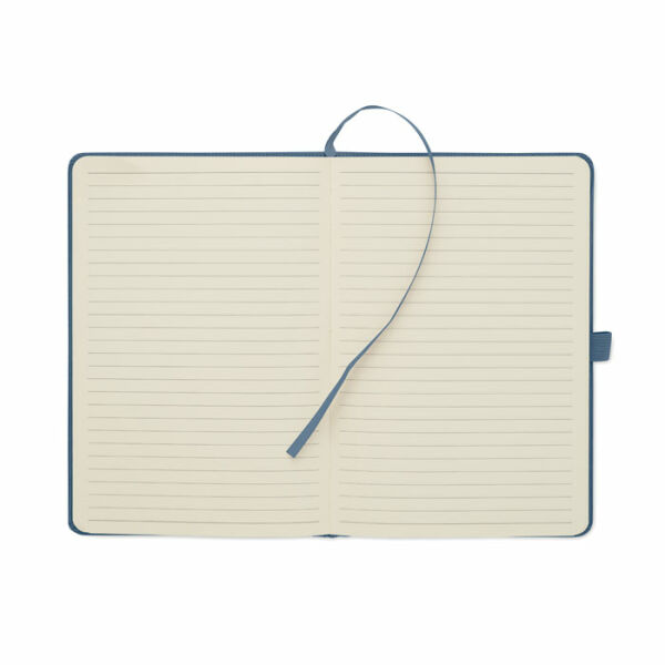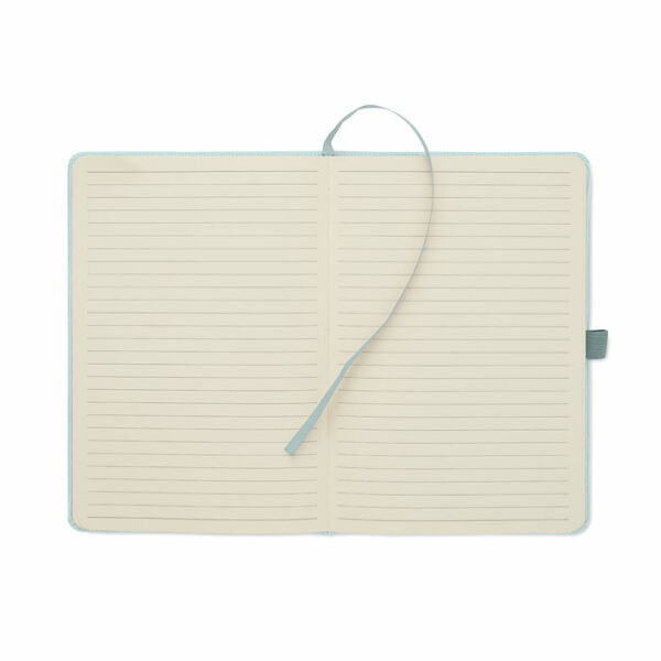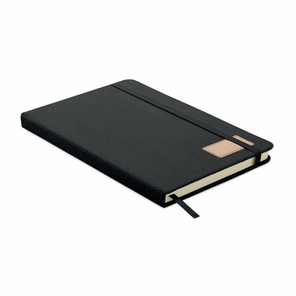 A5 notitieboek met harde RPET corduroy kaft en 192 gelinieerde pagina’s van gerecycled papier (70g/m²). Gebonden ontwerp met elastische sluitingsband, penlus, lintmarker en kraft papieren label.