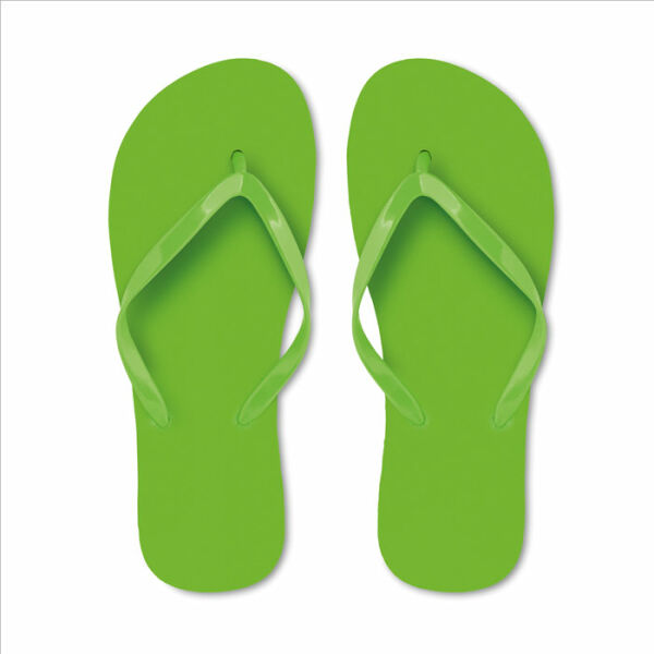 Strandslipper met polyethylene zool en PVC bandje. In twee maten verkrijgbaar. M is geschikt voor maat 36-39 en L voor maat 40-43.