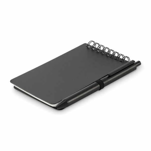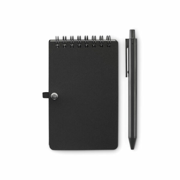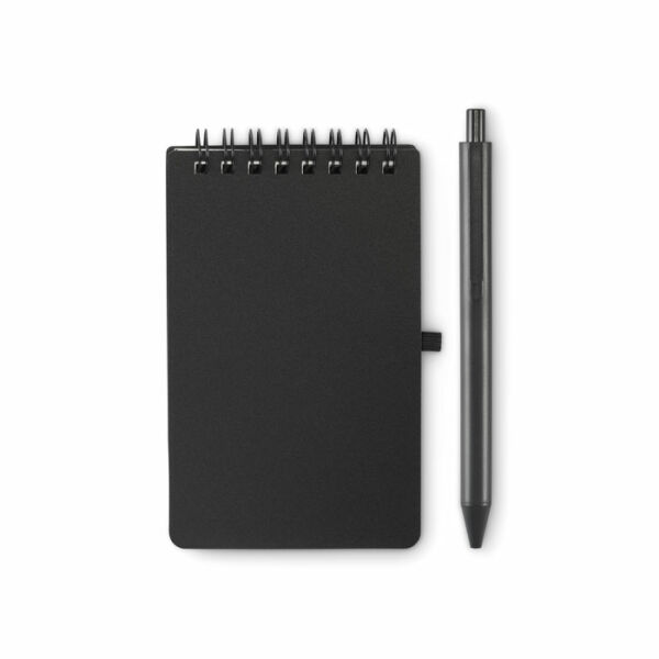 Waterafstotend notitieboekje met PP kaft en pen. Dubbelspiraal. Mineraal papier 120g/m², 50 vel gelinieerd. Blauwe inkt. Elastische sluitingsband en pennenlus.